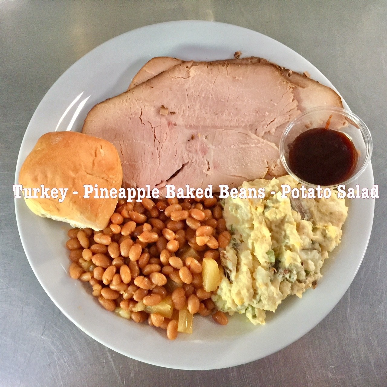 SMOKED TURKEY WITH YOUR CHOICE OF TWO SIDES AND A DINNER ROLL