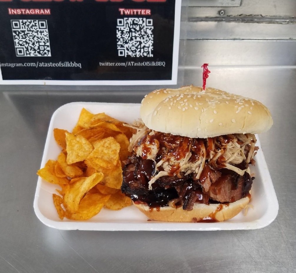 HOT LINK, BRISKET, PULLED PORK, DRIZZLED WITH SILKY SAUCE AND COMES WITH ONE SIDE OF YOUR CHOICE